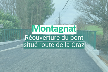 À Montagnat, les travaux de remplacement du pont situé route de la Craz à Montagnat sont désormais achevés. Le pont a rouvert à la circulation et sera de nouveau fermée courant janvier afin de permettre la poursuite des travaux de restauration de la Reyssouze.