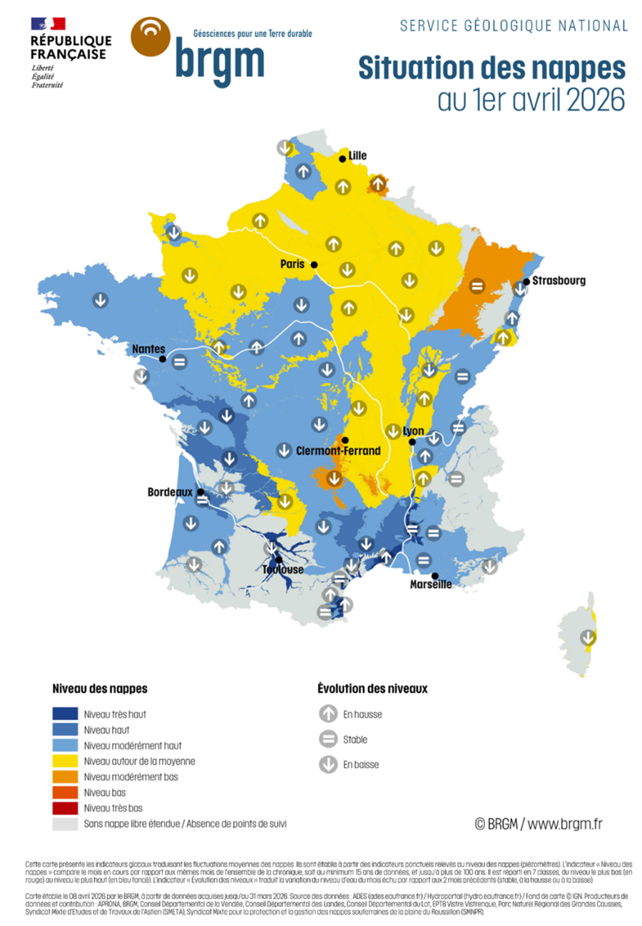 Source : BRGM : Bulletin de situation des nappes d’eau souterraine au 1er avril 2026