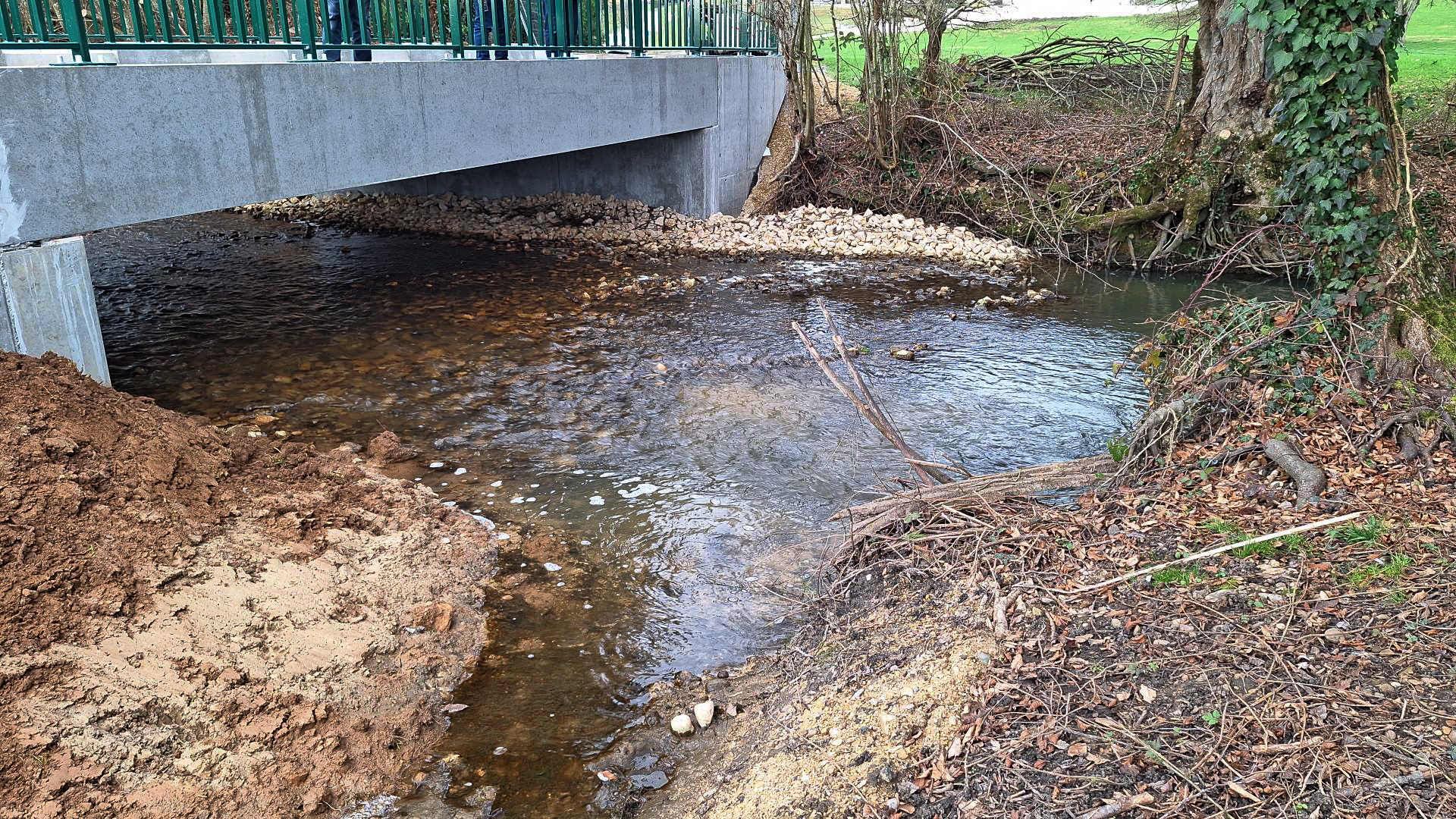Pour rappel, ce pont s’inscrit dans un projet plus global de restauration morpho-écologique de la Reyssouze et de son affluent, au niveau du moulin de la Craz. Son remplacement permet de rétablir une pente plus naturelle du cours d’eau, de limiter les risques d’inondation et de rétablir la continuité écologique.